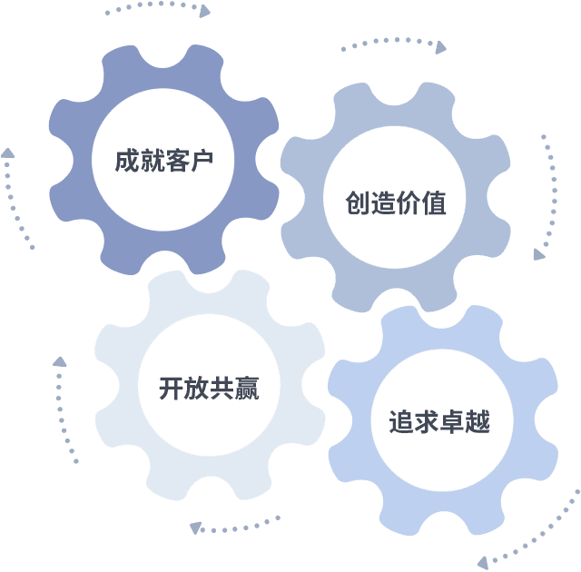 成就客户是一切决策的出发点,,创造价值是衡量所有工作的标准,,追求卓越是我们做事做人的态度,,开放共赢是我们的格局也是最终的结果。。价值观的齿轮环环相扣,,,推动着组织里的每个人不断向前。。。